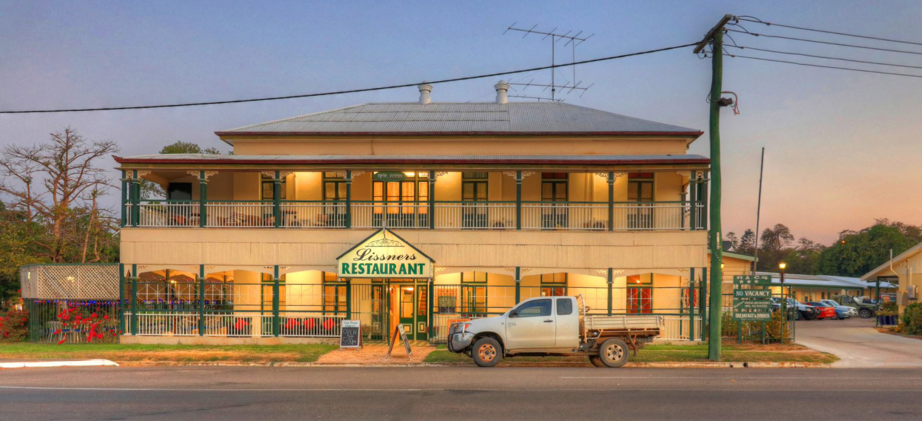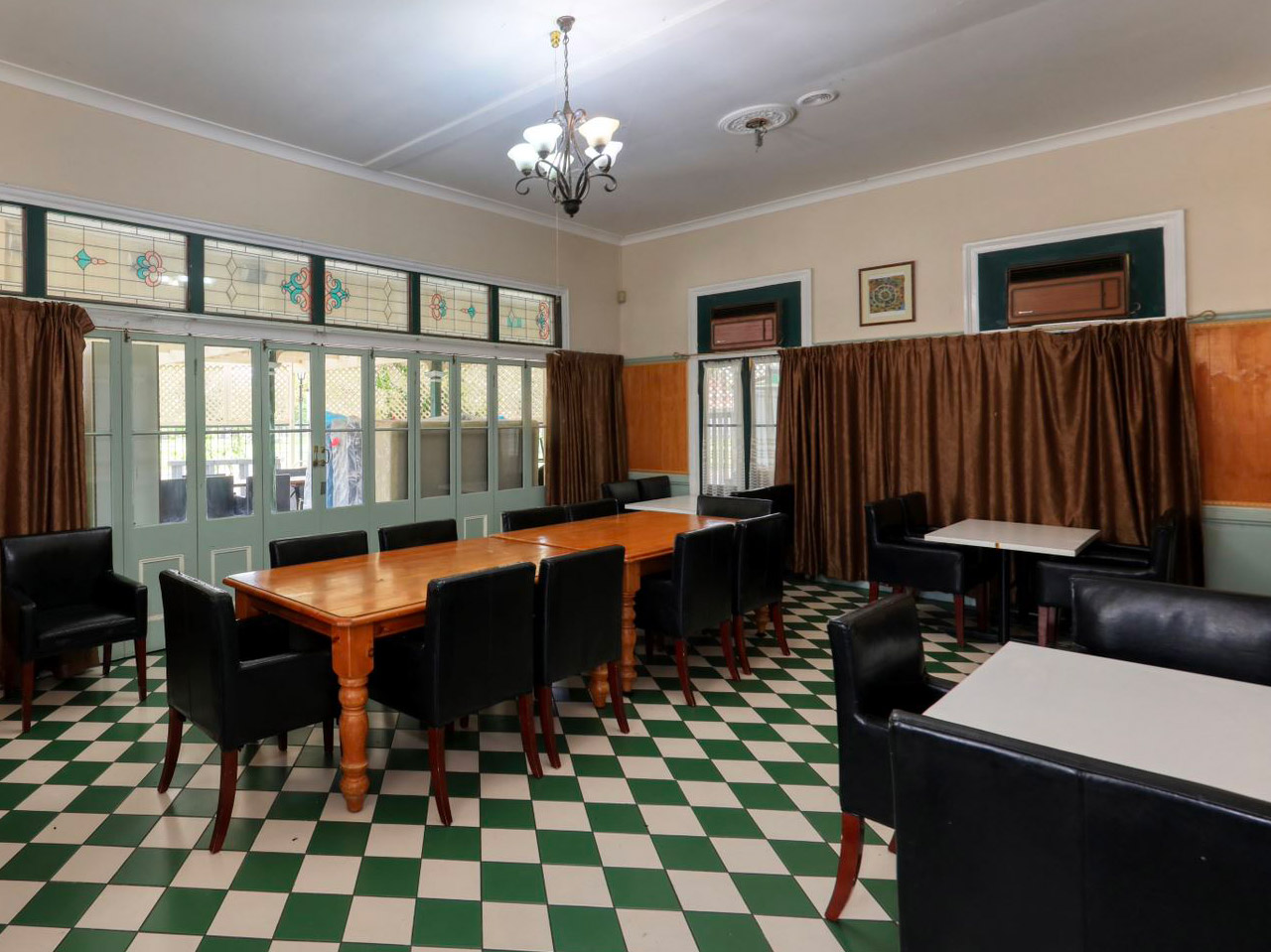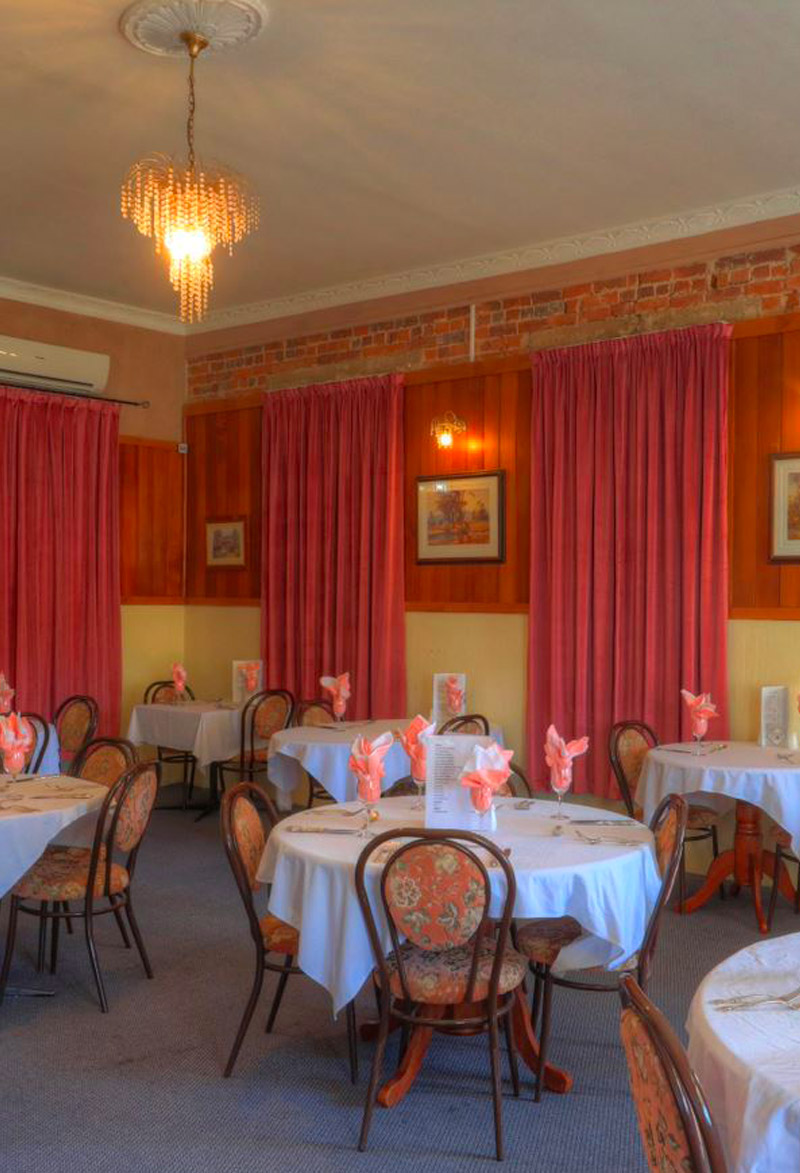 The dining room has a real atmosphere about it with artworks in the Jolly Swagman theme by Darcy Doyle within a historic façade. The design is quite unique for the area and offers country charm.